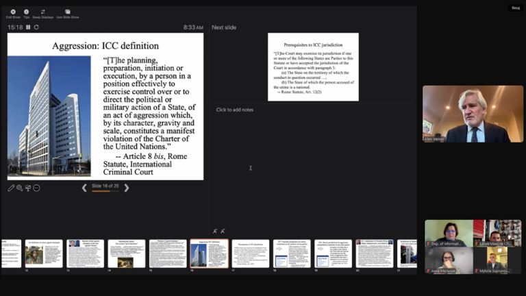 🔹 У межах трьох онлайн-зустрічей учасники обговорили ключові аспекти теми«Міжнародне право, застосування сили та вторгнення росії в Україну», зокрема: Jus ad Bellum – право на застосування сили;Jus in Bello – міжнародне гуманітарне право під час збройних конфліктів;Відповідальність за воєнні злочини.…